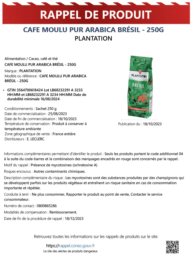 La marque PLANTATION rappelle son Café Moulu Pur Arabica Brésil – 250g, avec le GTIN 3564700618424, en raison de la présence de mycotoxines (ochratoxine A), un contaminant chimique. Les lots concernés sont LB68232291 A 3233 HH:MM et LB68232291 A 3234 HH:MM, avec une date de durabilité minimale au 16/08/2024.