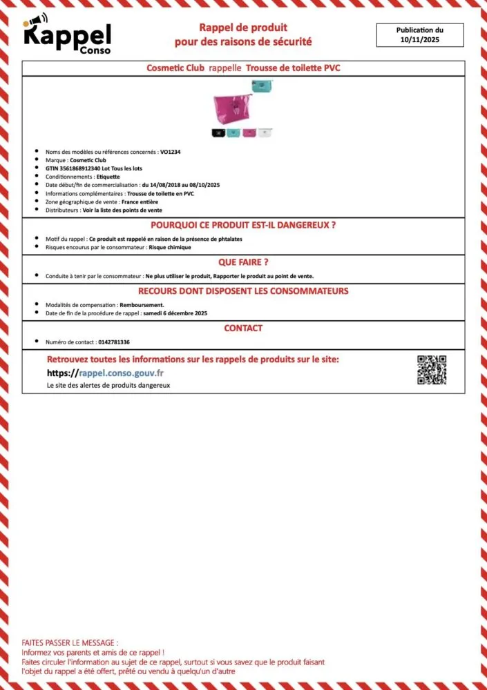 Un rappel de produit concerne actuellement plusieurs modèles de trousses de toilette en PVC de la marque Cosmetic Club, distribuées dans toute la France et également vendues à La Réunion. Les autorités appellent les consommateurs à cesser immédiatement d’utiliser ces articles, en raison de la présence de phtalates, substances reconnues pour leur toxicité potentielle.