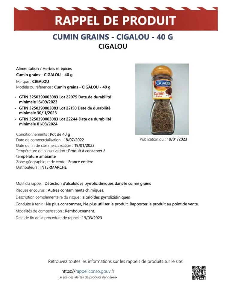 Motif du rappel : Détection d’alcaloïdes pyrrolizidiniques dans le cumin grains
