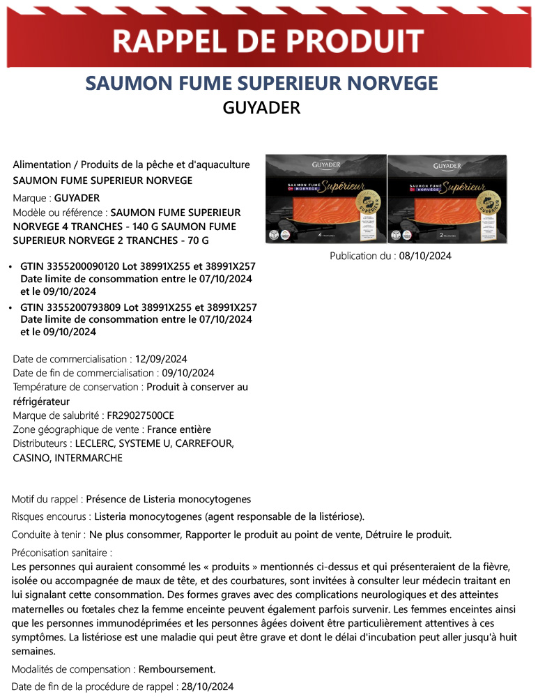 Récemment, plusieurs rappels de produits ont été émis par Rappel Conso, concernant principalement des produits de la mer. Les articles rappelés incluent du saumon fumé, des filets de truite fumée, du maquereau fumé et des moules. Ces produits ont été identifiés comme présentant des risques pour la santé, notamment en raison de la présence de Listeria monocytogenes , un agent pathogène responsable de la listériose.