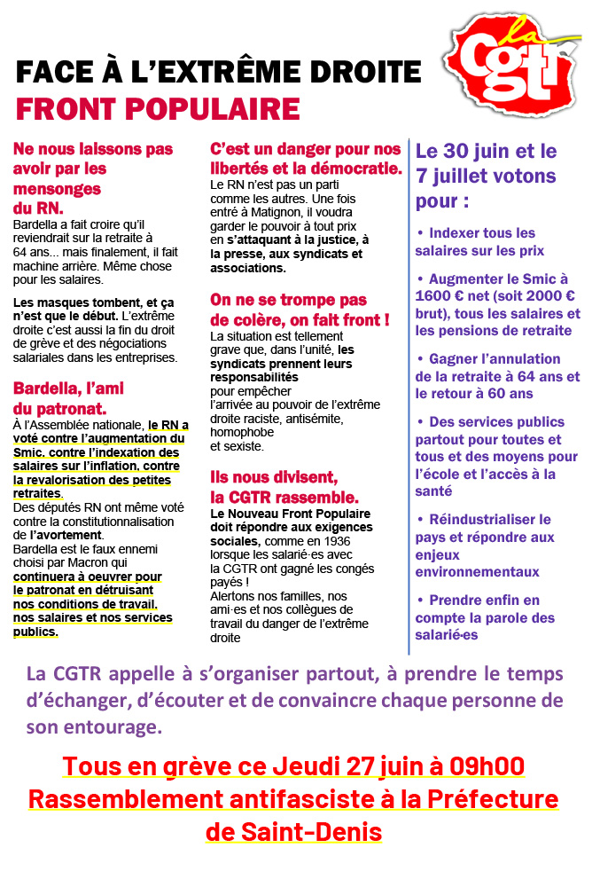 Au vu de la gravité de la situation, la CGTR considère que le programme du Nouveau Front Populaire est celui qui correspond le mieux aux attentes et aspirations des travailleuses et des travailleurs et qui ouvre le plus de possibilités de mobilisations gagnantes. La CGTR appelle les salariés, retraités et privés d’emploi à aller voter massivement les 30 juin et 7 juillet pour le programme du Nouveau Front Populaire. Cela ne constitue pas un chèque en blanc et encore moins une remise en cause de l’indépendance de la CGTR qui protégera toujours sa liberté d’expression et d’action.