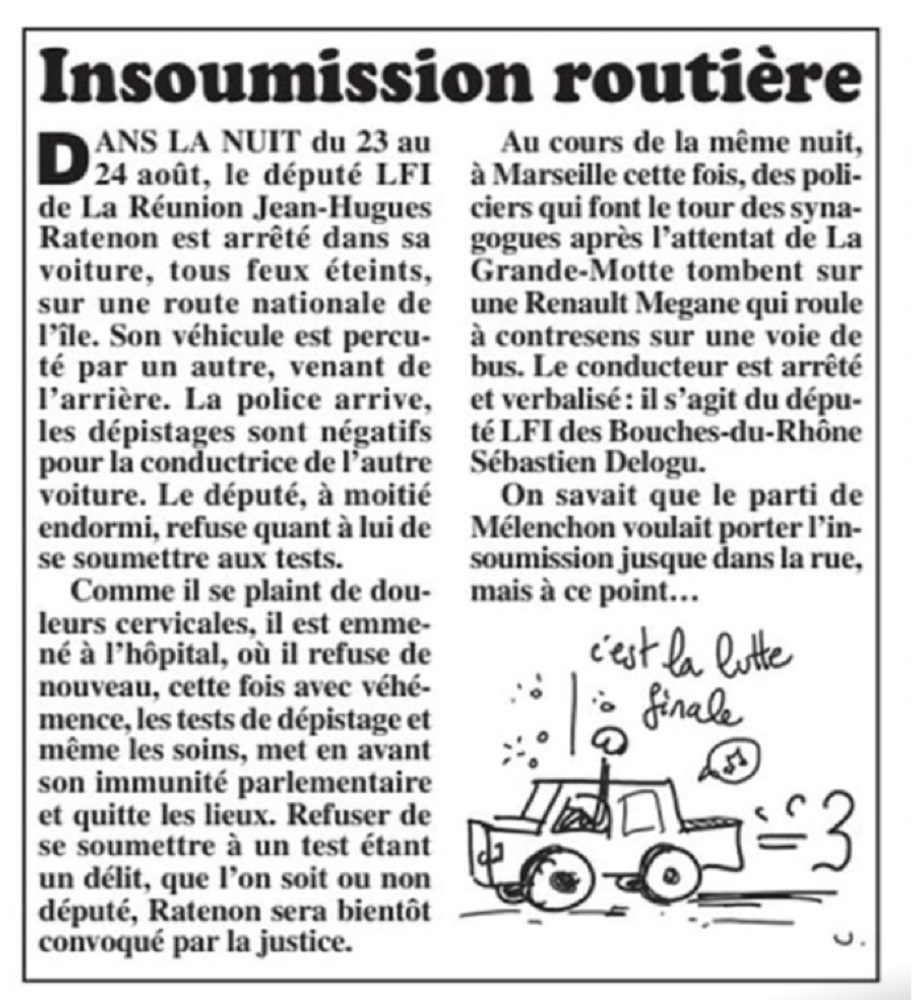 22. Le canard enchaîné n est pourtant pas un journal de droite loin de la , pour qu’ils en parlent c est que c’est suffisamment avéré . RATENON à pris le mot insoumis au 1er degré…”’moi contrôlé ? Jamais …