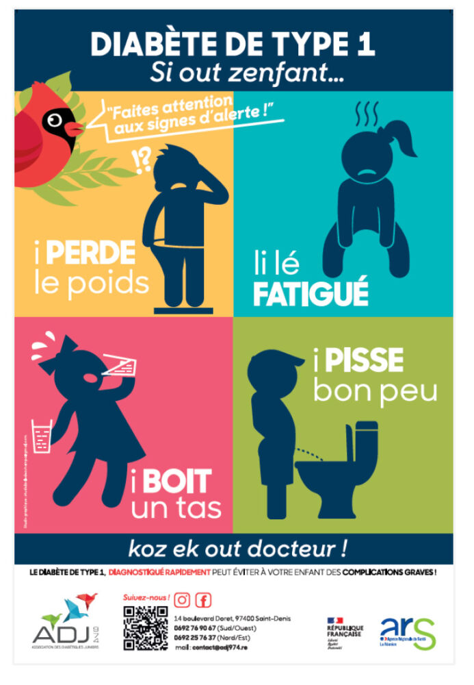 Poursuivant leur engagement, l’ARS La Réunion et l’Association des Diabétiques Juniors 974 (ADJ 974) lancent une nouvelle campagne de sensibilisation pour encourager la détection rapide des signes d’apparition du diabète de type 1 chez l’enfant : perte de poids, envies fréquentes d’uriner, soif excessive, fatigue… Cette campagne, qui s’appuie sur des affiches et des vidéos destinées au grand public ainsi qu’aux professionnels de santé, du social et de l’éducation, vise à renforcer la vigilance de tous et inciter les parents à consulter rapidement leur médecin dès les premiers symptômes. Un diagnostic précoce est une priorité pour sauver des vies.