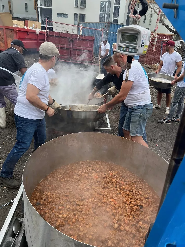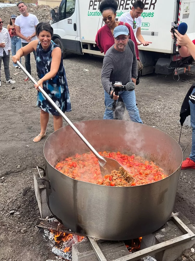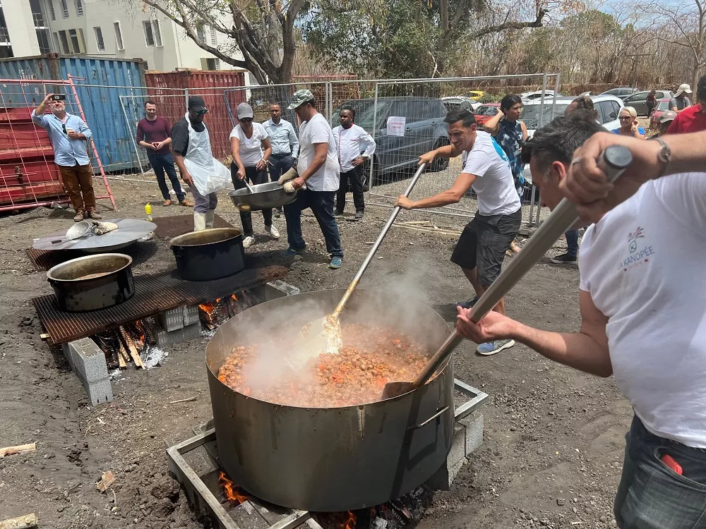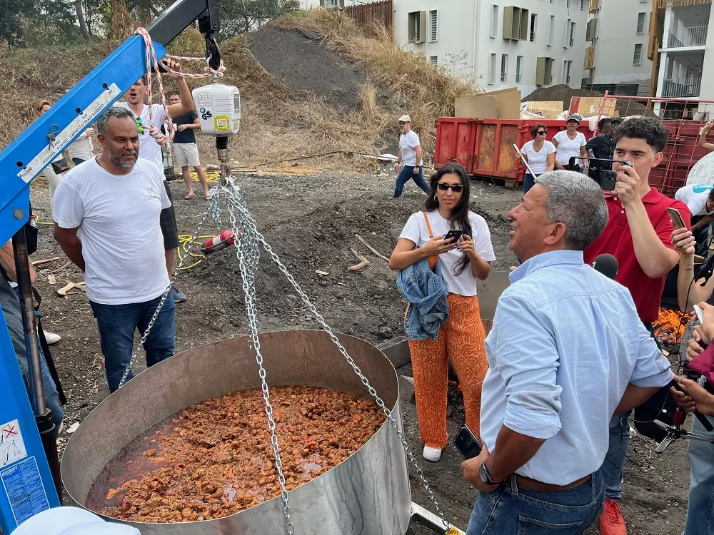 Le chantier de la Kanopée a démarré il y a 8 mois. Les conditions sanitaires ne permettant pas alors de fêter l’évènement, c’est ce samedi que le Groupe Opale-Alsei a invité les habitants du quartier à partager un moment convivial lors d’une journée d’échanges autour de nombreuses animations rythmées par les concerts et le partage d’un repas ouvert à tous. A cette occasion, il leur a été proposé de battre un record mondial : celui du plus grand rougail saucisse ! Il a fallu 330 KG de saucisses, 110 kilos de tomates, 120 kilos d’oignons, des épices en quantité, 1500 barquettes de 250 grammes de riz, 500 kilos de bois, pour la préparation de ce rougail saucisse géant. Le record a été homologué par huissier de justice assermenté. Les habitants et les usagers de la Kanopée ont ainsi pu goûter, dès à présent, au vivre-ensemble mis en valeur et consolidé dans la première smart-city d’outre-mer.