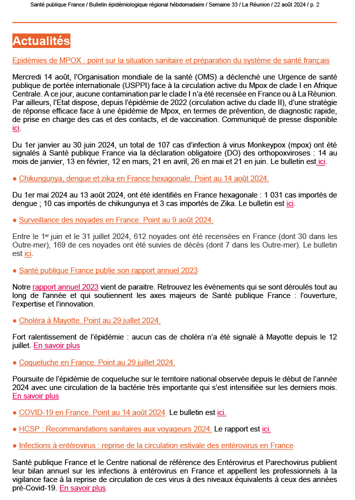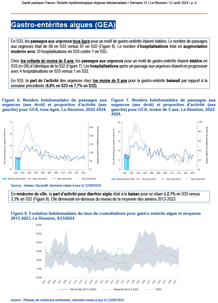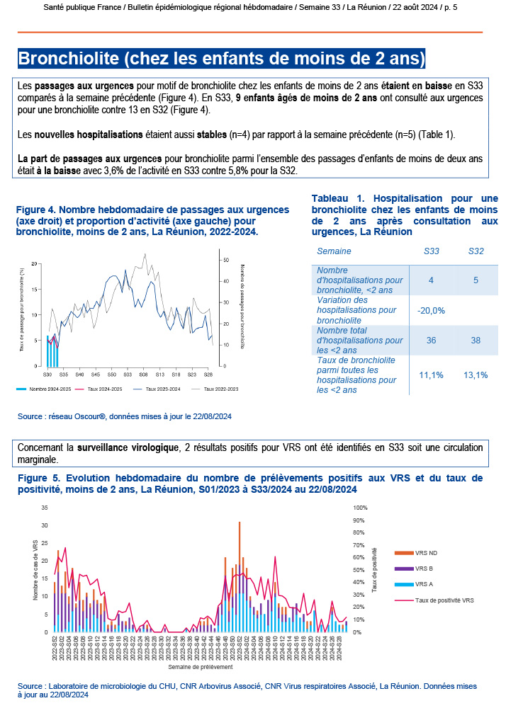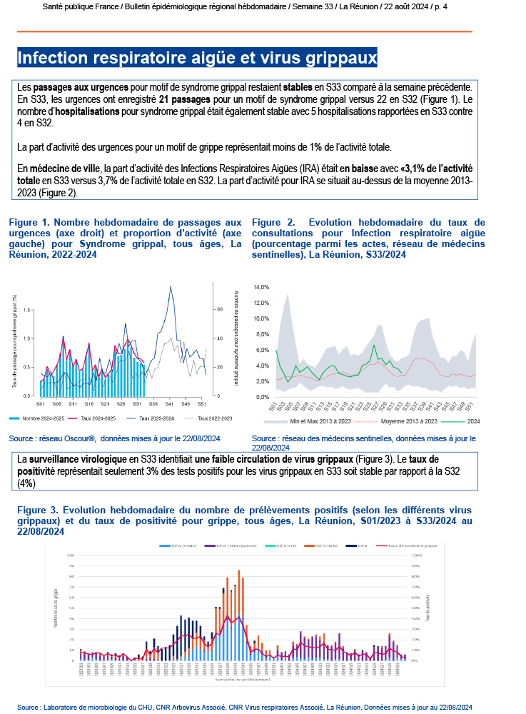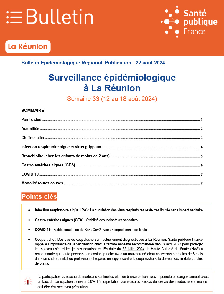 Santé Publique France a publié le point épidémiologique régional pour la semaine 33, couvrant la période du 12 au 18 août 2024. La situation sanitaire générale demeure stable dans plusieurs secteurs. Les infections respiratoires aiguës (IRA) continuent de circuler de manière limitée, sans impact notable sur le système de santé. Les indicateurs sanitaires relatifs aux gastro-entérites aiguës (GEA) restent également stables.