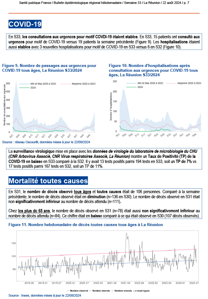 Concernant la COVID-19, la circulation du virus Sars-CoV-2 reste faible, avec un impact sanitaire modéré.