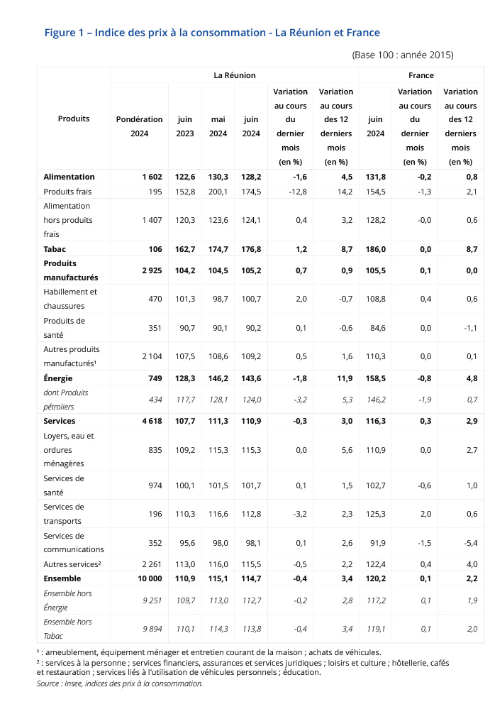 En juin 2024, l’indice des prix à la consommation recule de 0,4 % à La Réunion, après une hausse de 0,2 % en mai. Les prix de l’alimentation reculent pour le troisième mois consécutif, ceux des services et de l’énergie repartent à la baisse, tandis que les prix des produits manufacturés et du tabac augmentent.