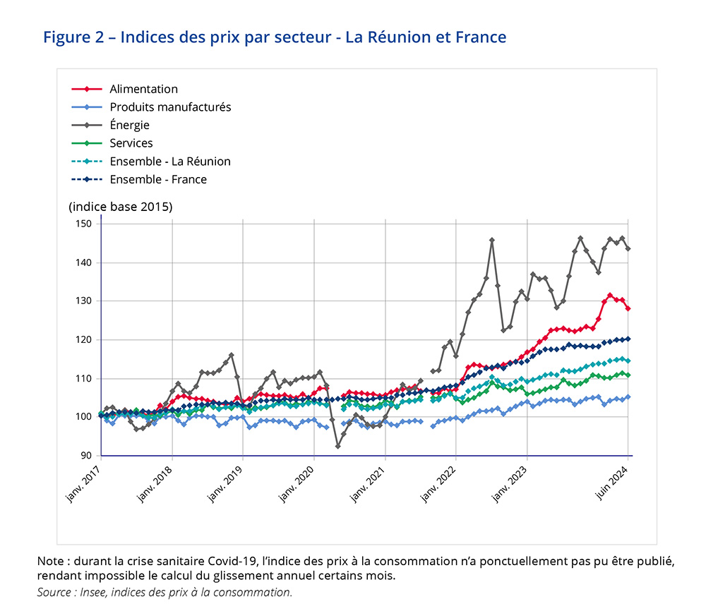 Les prix de l’alimentation baissent fortement en juin (-1,7 %), après -0,1 % en mai et -0,8 % en avril. Une fois encore, ce sont les prix des produits frais qui reculent, très fortement en juin par rapport au mois précédent (-12,8 %). Néanmoins, les prix des produits frais n’ont pas encore retrouvé le niveau de janvier, avant le passage du cyclone Belal. Hors produits frais, les prix de l’alimentation repartent à la hausse (+0,4 %) après une stabilité en mai.