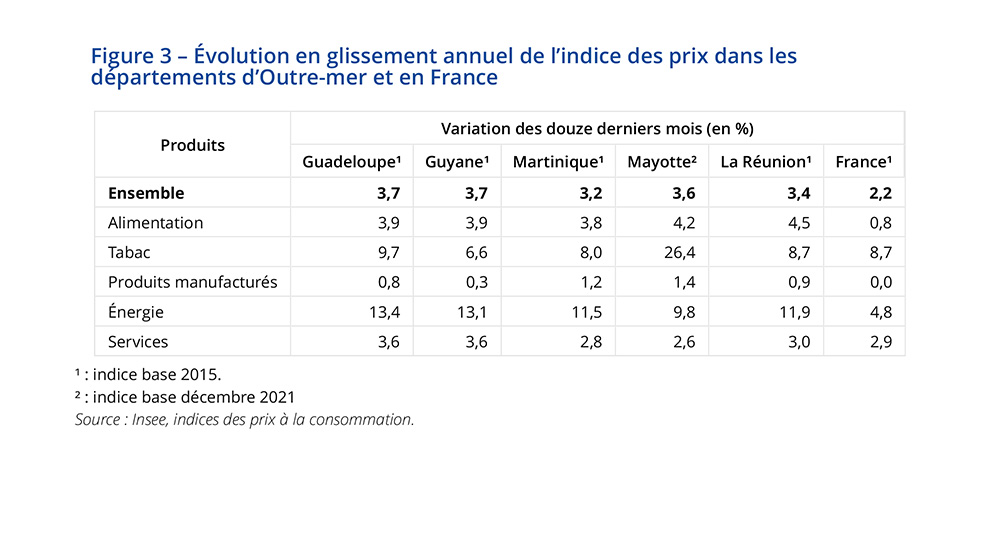 Sur un an, les prix de l’énergie augmentent davantage à La Réunion qu’en France (+11,9 % en juin contre +4,8 %). Les prix de l’énergie accélèrent en glissement annuel pour le deuxième mois consécutif (+6,6 % en avril, +10,1 % en mai). Cette hausse est portée par celle des prix de l’électricité (+21,7 % sur un an) et des produits pétroliers (+5,3 % sur un an).