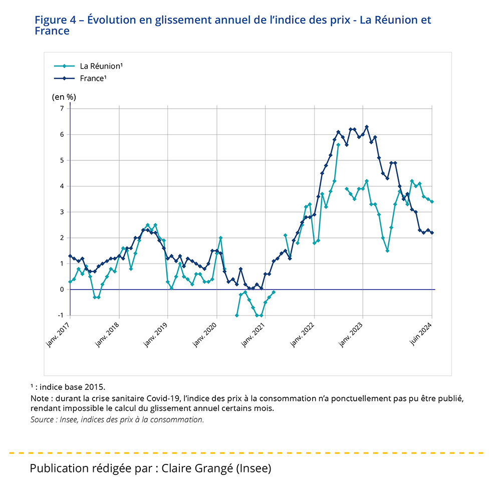 Sur un an, l’inflation ralentit de nouveau en juin (+3,4 %), comparativement au trois premiers mois de l’année durant lesquels l’inflation annuelle était égale ou légèrement supérieure à 4 %. L’indice des prix à la consommation augmente davantage à La Réunion qu’au niveau national (+2,2 %).
