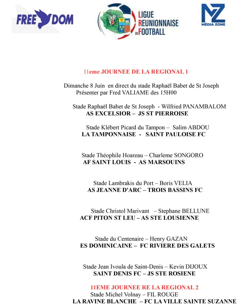 Rendez-vous ce dimanche 8 juin pour la 11ème journée de Régional 1, avec un multiplex à suivre en direct sur Free Dom. Fred VALIAME prendra l’antenne dès 15h pour vous faire vivre en temps réel les matchs phares de cette nouvelle journée de championnat.