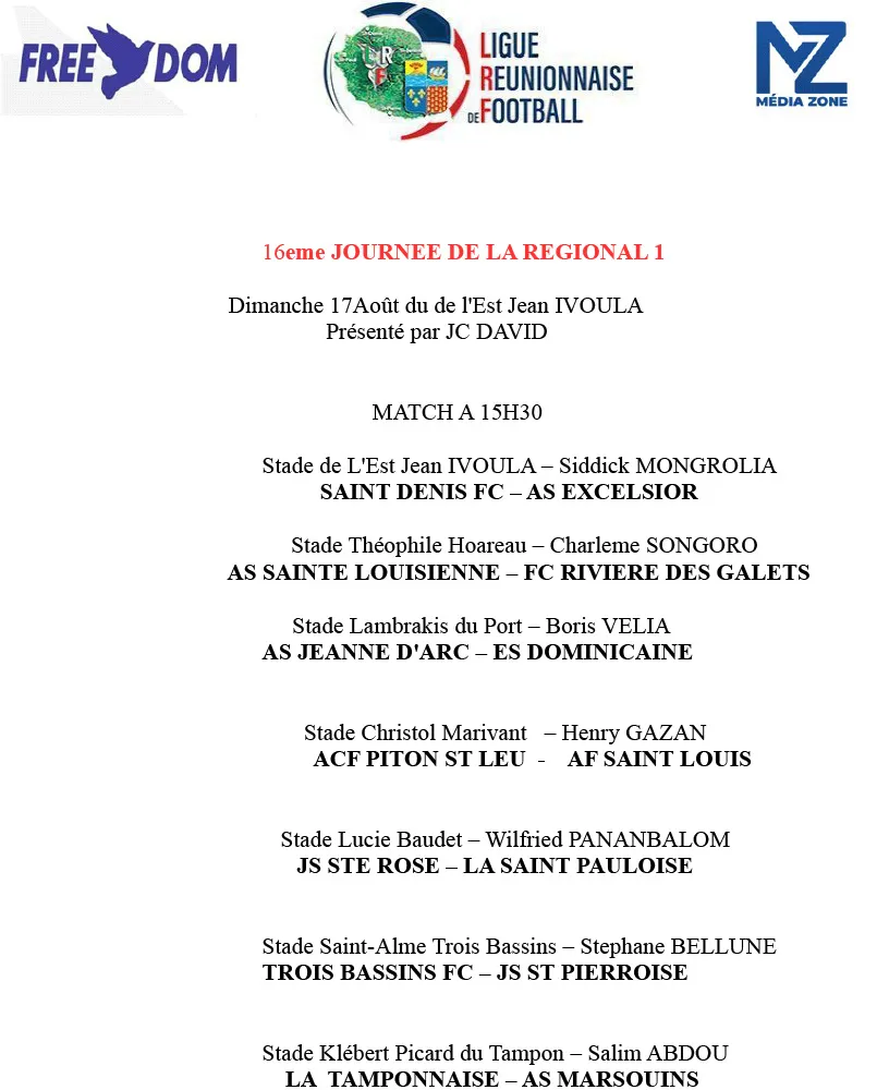Ce dimanche 17 août, les amateurs de football réunionnais ont rendez-vous avec la 16ᵉ journée de Régionale 1. Présentée en direct sur nos ondes Free Dom par Jean-Claude David, cette nouvelle étape du championnat promet des rencontres intenses aux quatre coins de l’île.