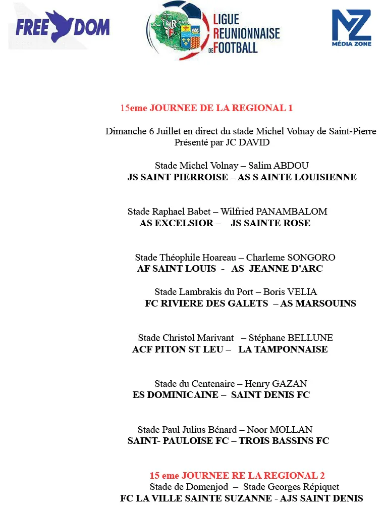 Les amateurs de football péi ont rendez-vous ce dimanche 6 juillet pour la 15e journée de Régionale 1 et Régionale 2. Plusieurs belles affiches sont au programme sur les terrains de l’île. Et bonne nouvelle : la journée sera à suivre en direct sur Free Dom, avec aux commentaires Jean-Louis David.
