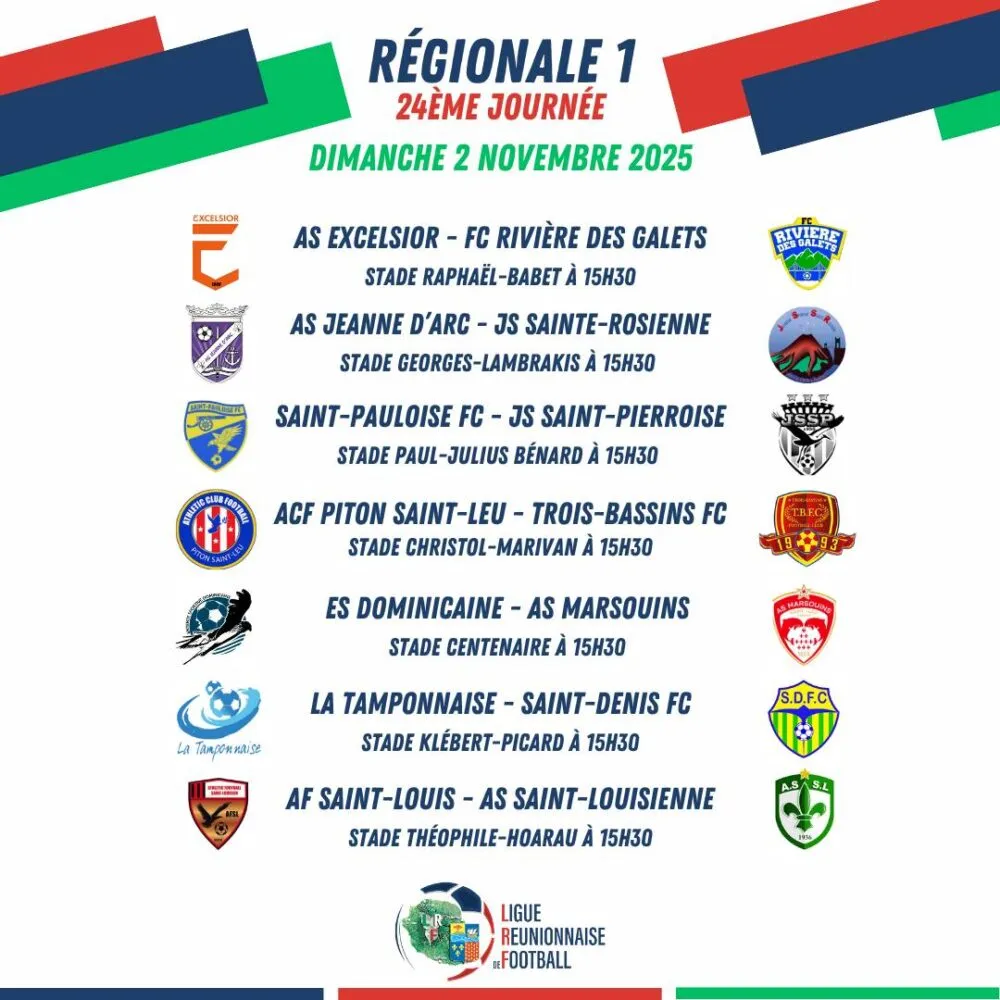 La 24ᵉ journée de Régionale 1 s’annonce intense et spectaculaire ce dimanche 2 novembre 2025, avec des affiches de haut niveau sur les différents stades de l’île. À ce stade de la saison, chaque point compte, et les clubs réunionnais sont déterminés à se battre jusqu’au bout pour consolider leurs positions au classement.