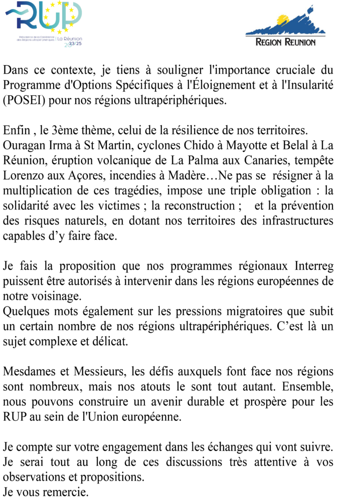 « La participation à haut niveau de ces trois instances européennes traduit toute l’attention accordée aux RUP et confère à cet évènement un caractère exceptionnel », a souligné la Présidente Huguette Bello, « cette rencontre a mis en avant l’esprit de responsabilité qui nous anime au moment où l’Union européenne s’engage dans de nouvelles perspectives politiques et financières pour les années 2028-2034. Nuire à la cohésion, ce serait non seulement une erreur politique mais plus encore une faute morale ».