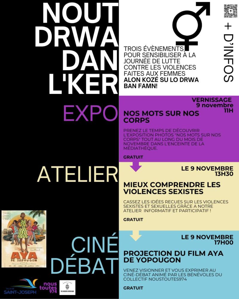 A ce titre le collectif Nous toutes 974 sera le samedi 9 novembre 2024 à la médiathèque pour 3 évènements pour sensibiliser à la lutte contre les violences faites aux femmes.