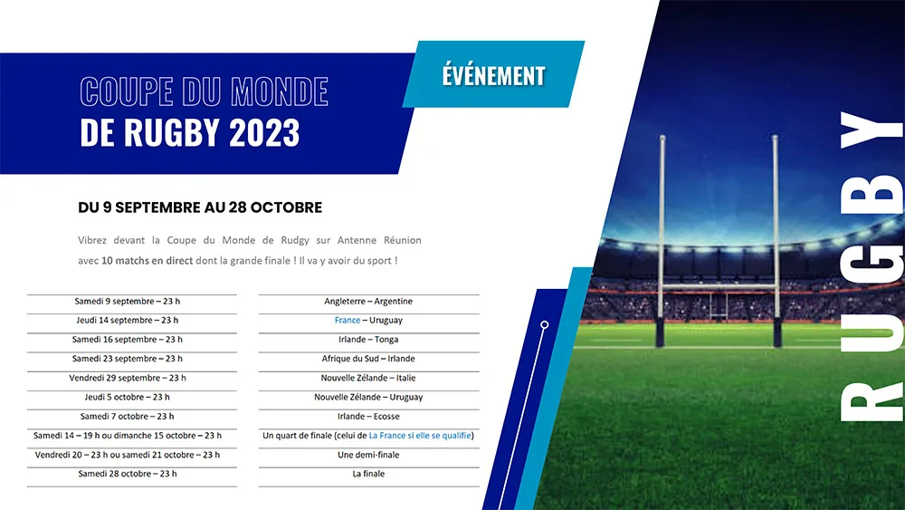 Le sport est l’invité phare de cette rentrée avec la Coupe du Monde de Rugby, les matchs qualificatifs de l’Euro, le Tour Cycliste Antenne Réunion et d’autres rendez-vous qui vont faire vibrer l’Antenne. Mais ce n’est pas tout, découvrez les nouveautés de la rentrée d’Antenne Réunion.3…2…1… C’est parti !