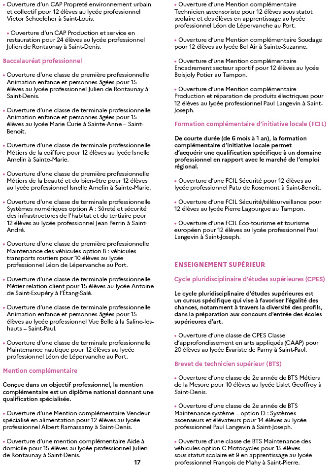 La rentrée 2024 marque aussi la poursuite de la réforme du lycée professionnel, qui vise à mieux préparer les jeunes à la fois pour l’entrée dans la vie active et pour la poursuite de leurs études. À cet effet, des classes spécifiques sont ouvertes dans plusieurs établissements, notamment des classes de CAP Propreté environnement urbain et collectif, ou encore des classes en animation enfance et personnes âgées. Des formations complémentaires en soudage et en encadrement sportif viennent étoffer l’offre de formation, garantissant des parcours plus adaptés aux besoins des jeunes Réunionnais.