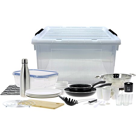 Pour la somme de 49€, on y trouve tout le nécessaire pour équiper sa cuisine : 1 boite de rangement 47L + 4 assiettes plates D26.5cm + 4 bols d13cm + 4 mugs 33cl + 4 gobelets FB 21cl + 1 ménagère 16pces + 3 torchons 45x60cm + 1 cuillère à spaghetti + 1 spatule + 1 passoire D21.5cm + 1 dessous de plat + 1 planche à découper + 1 couteau office + 1 bouteille isotherme 50cl + 3 boites de conservation 65-150-240cl + 1 égouttoir à couverts + 1 poêle d24cm + 1 casserole d16cm