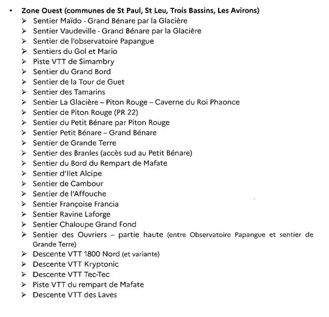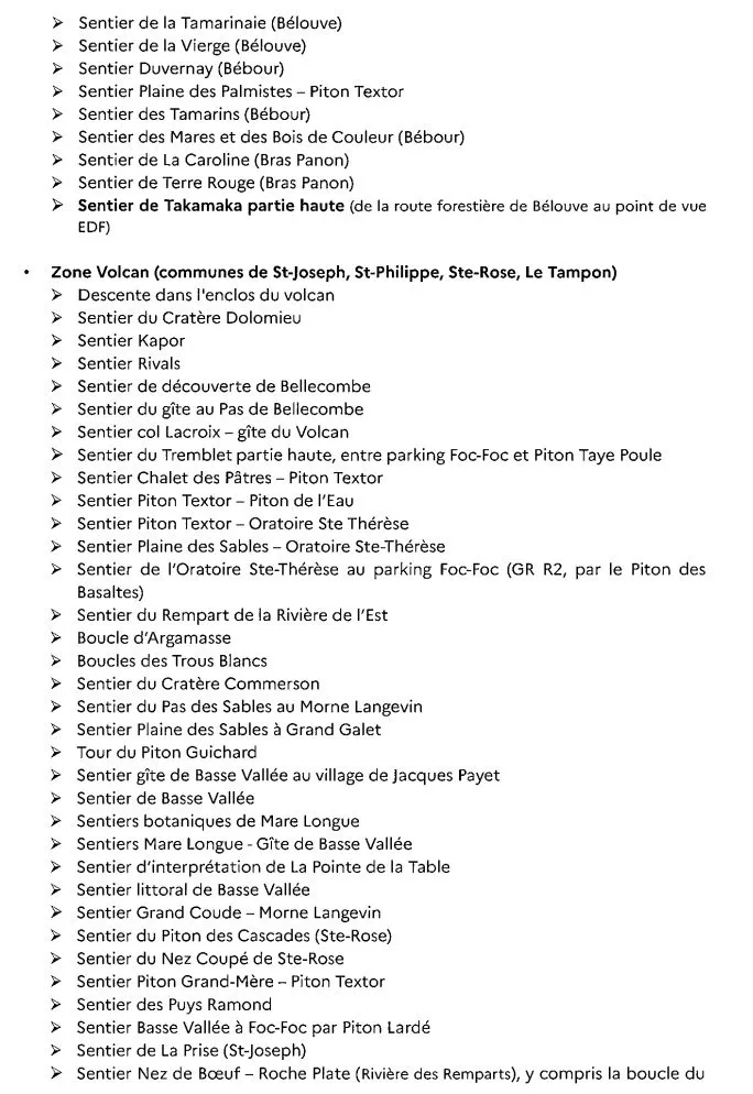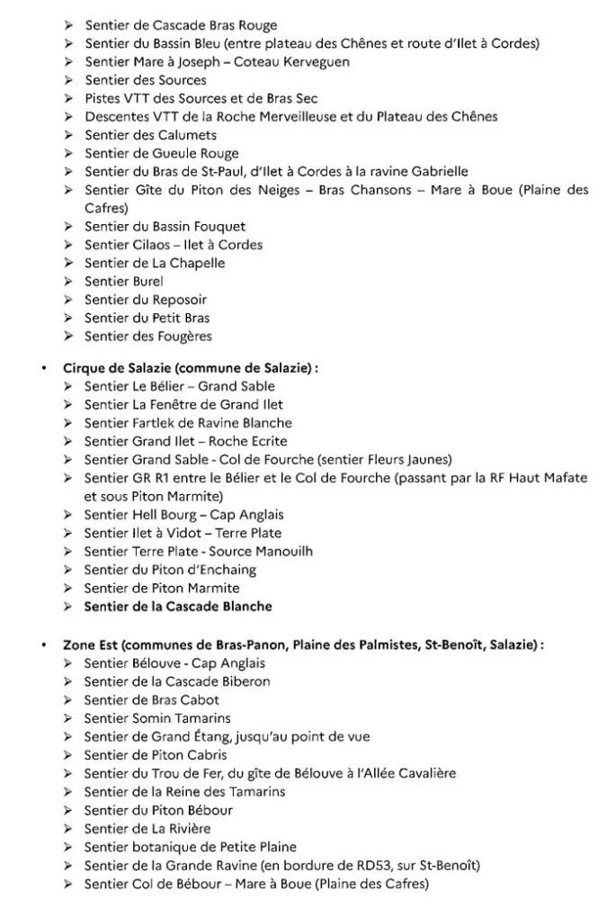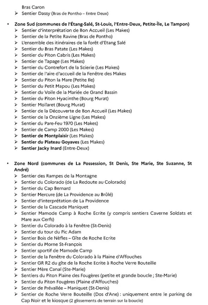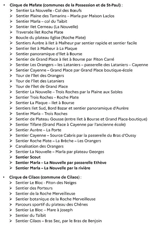- 3 sentiers dans le cirque de Mafate, dont le sentier Scout fermé le 03 avril dernier, très attendu par les habitants d’Aurère, Ilet à Malheur, Ilet à Bourse et Grand Place