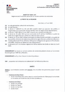 Arrêté n°2024-573 réglementant l’accès des personnes sur certains sentiers de randonnée-1 par Céline Hardelain 11 avril 2024 1 min de lecture Ne manquez pas toute l’actualité de La Réunion ! Abonnez-vous à la newsletter de Free Dom ! Valider Partager Facebook Twitter Pinterest Linkedin Whatsapp Reddit Email Céline Hardelain Laisser un commentaire Annuler la réponseYour email address will not be published. Enregistrer mon nom, mon e-mail et mon site dans le navigateur pour mon prochain commentaire. Current ye@r * Leave this field empty Articles récents... Jeudi 1ᵉʳ janvier 2026 – Météo, éphéméride et horoscope du jour Mercredi 31 décembre 2025 – Météo, éphéméride et horoscope du jour Hommage à Johnny Hallyday sur Free Dom 2 ce 5 décembre Mardi 30 décembre 2025 – Météo, éphéméride et horoscope du jour Saint-Joseph : découverte de 2337 plants de cannabis, arrestation de 2 individus Point sur le réseau routier départemental, 29 décembre à 16H30 Suicide sur le pont de la Rivière d’Abord : importante mobilisation des secours et des forces de l’ordre Radier submergé à Ilet Furcy : la route de Cilaos fermée à la circulation cette nuit Fortes pluies : appel à la plus grande prudence à Saint-Paul