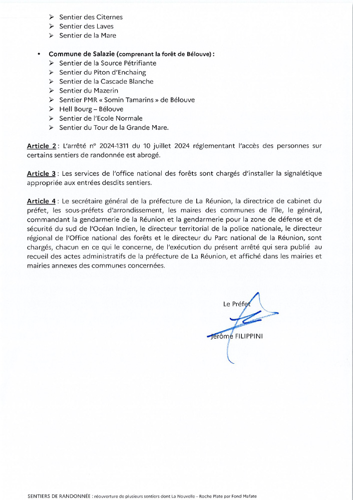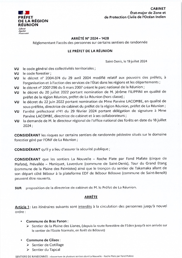 Suite aux travaux réalisés par les équipes de l’ONF, les sentiers La Nouvelle – Roche Plate par Fond Mafate (cirque de Mafate), Prévallée – Maniquet, Laverdure (commune de Saint-Denis), Tour du Grand Etang (commune de la Plaine des Palmistes) ainsi que le tronçon du sentier de Takamaka allant de son départ côté Bébour à la plateforme EDF de Bébour Bélouve (commune de Saint-Benoît) peuvent être rouverts.
