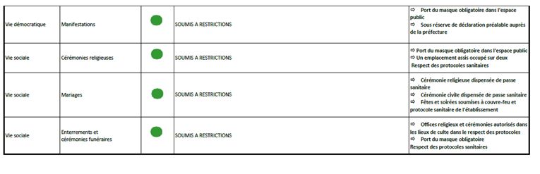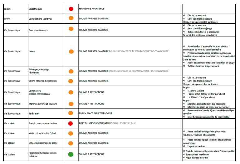 Afin de limiter l’impact économique des mesures de restriction et de préserver l’emploi tout en freinant la propagation du Covid-19 sur le territoire, les établissements recevant du public qui étaient fermés depuis le 2 août pourront ré-ouvrir à partir du 10 août sous condition d’application du Passe sanitaire. Toutes les restrictions de jauges dans les établissements soumis au Passe sanitaire sont levées.