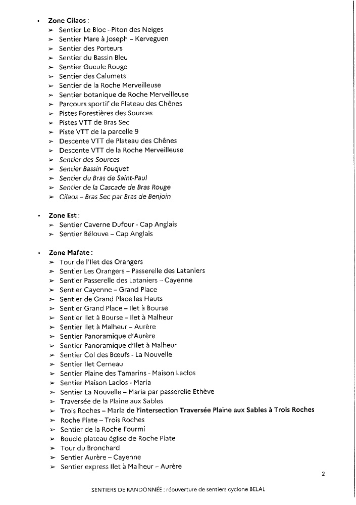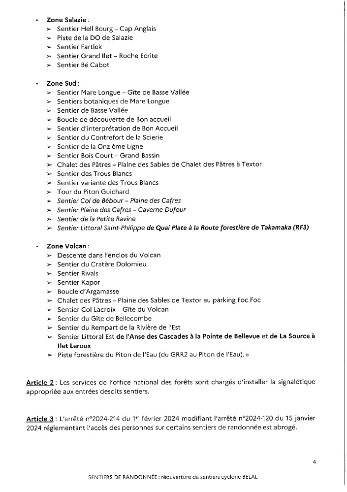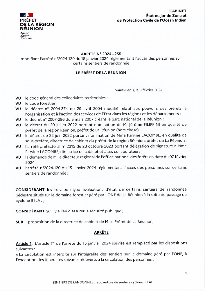 Suite aux travaux et/ou évaluations d’état des sentiers de randonnée pédestre situés sur le domaine forestier géré par l’ONF La Réunion, à la suite du passage du cyclone BELAL et des intempéries, certains sentiers peuvent être réouverts, conformément à l’arrêté préfectoral ci-joint.