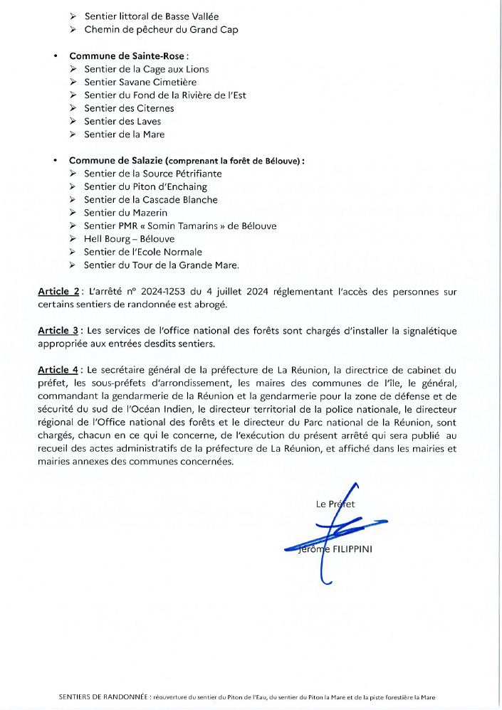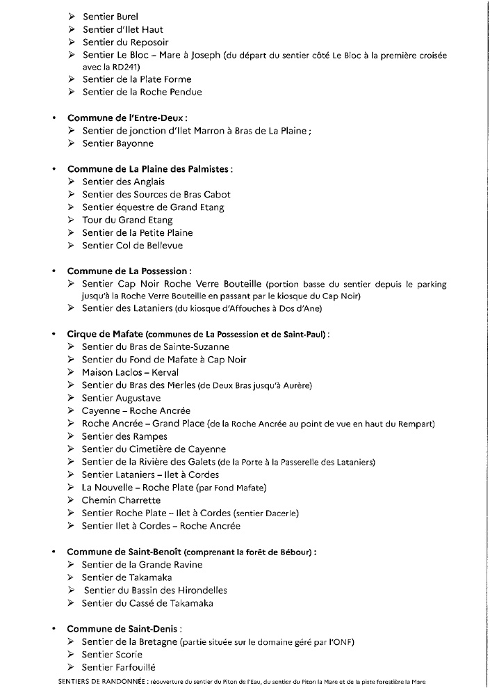 Actualités Réouverture du sentier du Piton de l’Eau, du Piton de la Mare et de la piste forestière de la Mare par Céline Hardelain 8 juillet 2024 1 min de lecture Suite aux travaux réalisés par les équipes de l’ONF, les sentiers du Piton de l’Eau (commune de La Plaine des Palmistes), du Piton la Mare et la piste forestière de la Mare (commune de Petite-Île) peuvent être rouverts. Ne manquez pas toute l’actualité de La Réunion ! Abonnez-vous à la newsletter de Free Dom ! Valider Partager Facebook Twitter Pinterest Linkedin Whatsapp Reddit Email Vous pourriez être intéressé par 2 janvier 2026 1 janvier 2026 Jeudi 1ᵉʳ janvier 2026 – Météo, éphéméride et horoscope du jour 31 décembre 2025 Mercredi 31 décembre 2025 – Météo, éphéméride et horoscope du jour Céline Hardelain Laisser un commentaire Annuler la réponseYour email address will not be published. Enregistrer mon nom, mon e-mail et mon site dans le navigateur pour mon prochain commentaire. Current ye@r * Leave this field empty Article précédent Air Austral immobilise un airbus A220-300 en raison de problèmes moteurs Article suivant Octroi de mer sur les traitements utilisés dans les essais thérapeutiques contre le cancer Articles récents... Jeudi 1ᵉʳ janvier 2026 – Météo, éphéméride et horoscope du jour Mercredi 31 décembre 2025 – Météo, éphéméride et horoscope du jour Hommage à Johnny Hallyday sur Free Dom 2 ce 5 décembre Mardi 30 décembre 2025 – Météo, éphéméride et horoscope du jour Saint-Joseph : découverte de 2337 plants de cannabis, arrestation de 2 individus Point sur le réseau routier départemental, 29 décembre à 16H30 Suicide sur le pont de la Rivière d’Abord : importante mobilisation des secours et des forces de l’ordre Radier submergé à Ilet Furcy : la route de Cilaos fermée à la circulation cette nuit Fortes pluies : appel à la plus grande prudence à Saint-Paul