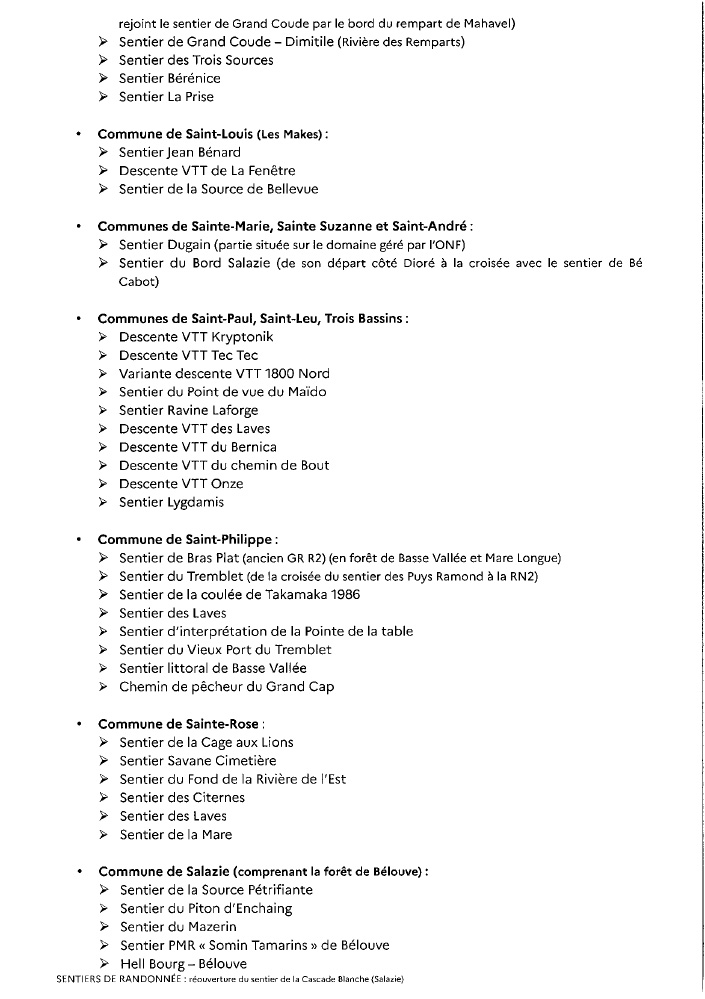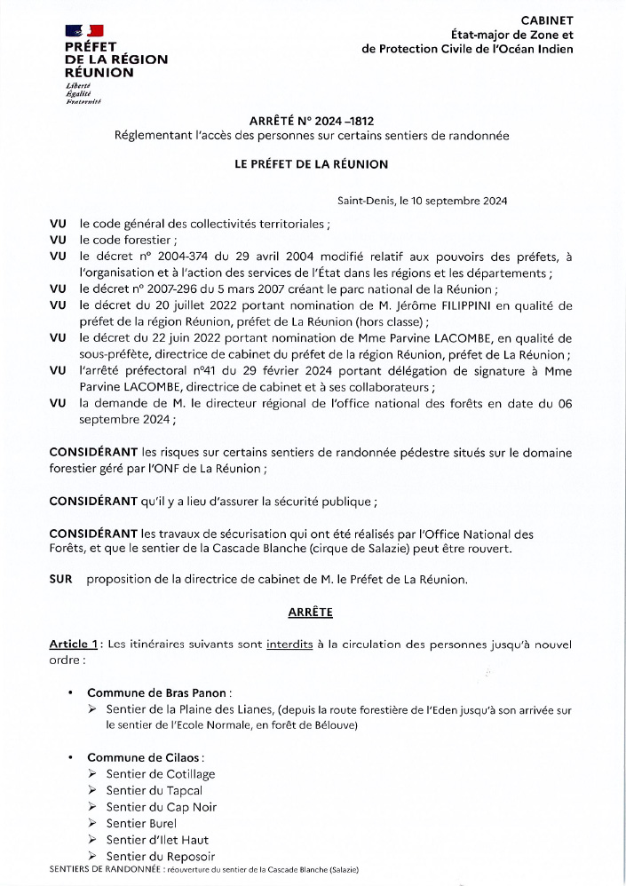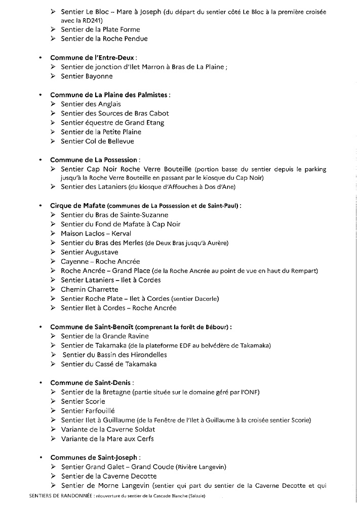 Actualités Réouverture du sentier sécurisé de la Cascade Blanche à Salazie par Céline Hardelain 13 septembre 2024 1 min de lecture Les travaux de réhabilitation de la plateforme du sentier de la Cascade Blanche, situé dans le cirque de Salazie, étant achevés, le sentier sécurisé peut désormais être rouvert. Ne manquez pas toute l’actualité de La Réunion ! Abonnez-vous à la newsletter de Free Dom ! Valider Partager Facebook Twitter Pinterest Linkedin Whatsapp Reddit Email Vous pourriez être intéressé par 1 janvier 2026 Jeudi 1ᵉʳ janvier 2026 – Météo, éphéméride et horoscope du jour 31 décembre 2025 Mercredi 31 décembre 2025 – Météo, éphéméride et horoscope du jour 30 décembre 2025 Mardi 30 décembre 2025 – Météo, éphéméride et horoscope du jour Céline Hardelain Laisser un commentaire Annuler la réponseYour email address will not be published. Enregistrer mon nom, mon e-mail et mon site dans le navigateur pour mon prochain commentaire. Current ye@r * Leave this field empty Article précédent XTREM-FIGHT 431 : combat au sommet ce samedi à La Plaine des Palmistes Article suivant Aujourd’hui, c’est vendredi 13 : jour de chance ou de malchance ? Articles récents... Jeudi 1ᵉʳ janvier 2026 – Météo, éphéméride et horoscope du jour Mercredi 31 décembre 2025 – Météo, éphéméride et horoscope du jour Hommage à Johnny Hallyday sur Free Dom 2 ce 5 décembre Mardi 30 décembre 2025 – Météo, éphéméride et horoscope du jour Saint-Joseph : découverte de 2337 plants de cannabis, arrestation de 2 individus Point sur le réseau routier départemental, 29 décembre à 16H30 Suicide sur le pont de la Rivière d’Abord : importante mobilisation des secours et des forces de l’ordre Radier submergé à Ilet Furcy : la route de Cilaos fermée à la circulation cette nuit Fortes pluies : appel à la plus grande prudence à Saint-Paul Saint-Gilles-les-Bains : une route impraticable, les riverains montent au créneau (VIDEOS)