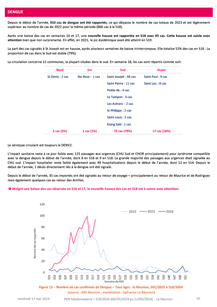· Dengue : Ré-augmentation du nombre de cas après une baisse de 2 semaines. St Joseph concentre la moitié des cas.