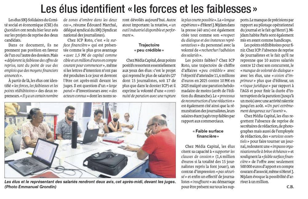 « Henri Nijdam (Media Capital) a fait l’effort d’améliorer son offre et propose désormais de reprendre 12 employés de presse et cadres et 15 journalistes – mais sans secrétaires de rédaction, photographes et rédacteurs en chef – soit 55% du personnel. C’est mieux, ou moins pire, mais cela reste nettement insuffisant pour faire tourner le journal et fournir une information de qualité et de proximité. Surtout, les salariés appellent les porteurs de ce projet à lever les zones d’ombre sur l’actionnariat, la gouvernance et l’organisation du journal. Ils réclament des garanties d’indépendance de la rédaction et une information libre pour les lecteurs, et rejettent par avance toute tentative d’instrumentalisation » indiquait hier le SNJ, syndicat national des journalistes.