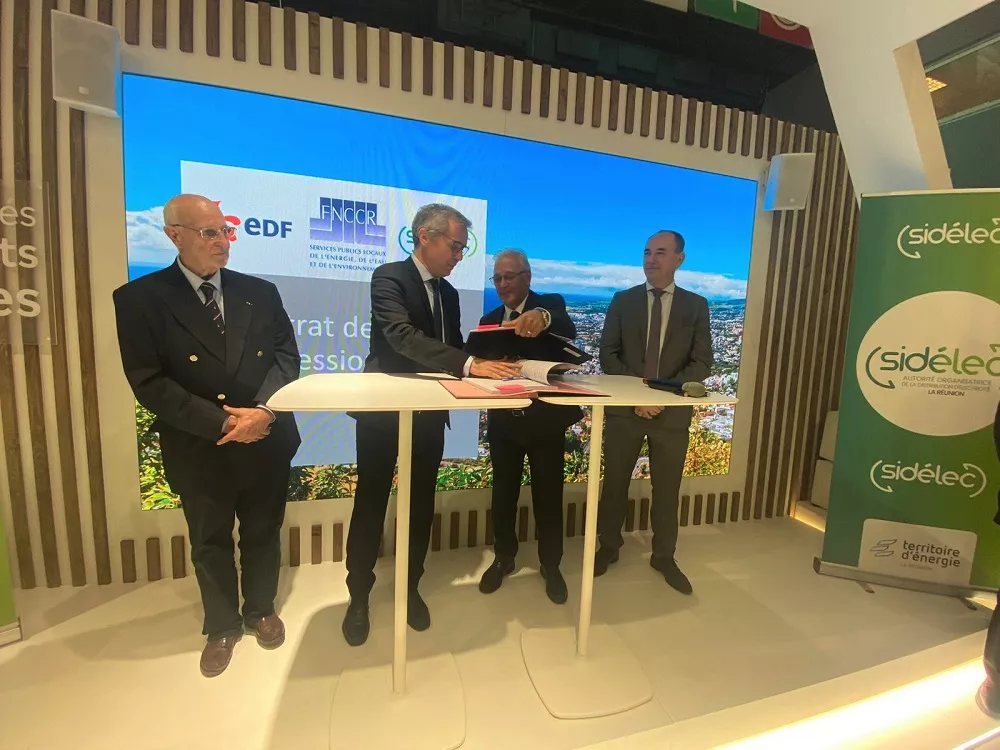 Le 22 novembre, Maurice Gironcel, président du SIDELEC (Syndicat intercommunal d’électricité de La Réunion) et Olivier Meyrueis, directeur régional d’EDF à La Réunion, ont signé un nouveau contrat de concession pour le service public du développement et l’exploitation du réseau de distribution d’électricité et de la fourniture d’électricité aux tarifs réglementés de vente. Cet évènement s’est déroulé au salon des maires, à Paris, en présence de Guy Hourcabie, président délégué de la FNCCR (Fédération nationale des collectivités concédantes et régies), d’Antoine Jourdain, directeur EDF de la DSEI (Direction des systèmes énergétique insulaires) et de Serge Hoareau, président de l’AMDR (Association des maires de la Réunion).