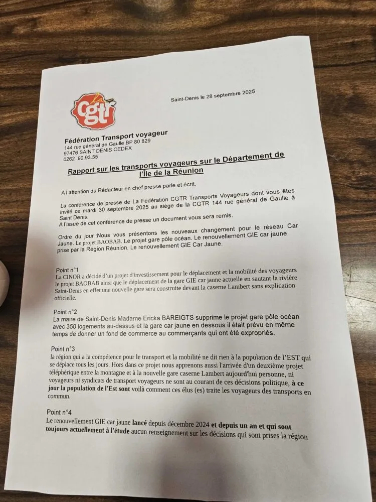 Selon la CGTR, ces choix ont été pris par la maire de Saint-Denis, Ericka Bareigts, avec l’accord d’élus et de responsables intercommunaux (la CINOR, la SODIPARC) et de la collectivité régionale. Le syndicat affirme que la gare actuelle du GIE « Car Jaune » serait déplacée vers l’arrière de la caserne Lambert sans explication officielle, privant ainsi les habitants de l’Est et du Nord d’un accès pratique aux transports en commun. Le renouvellement du GIE Car Jaune, lancé en décembre 2024, resterait « à l’étude » depuis un an, sans informations claires sur les décisions à venir, ajoutent les documents syndicaux datés du 30 juillet et du 28 septembre 2025.