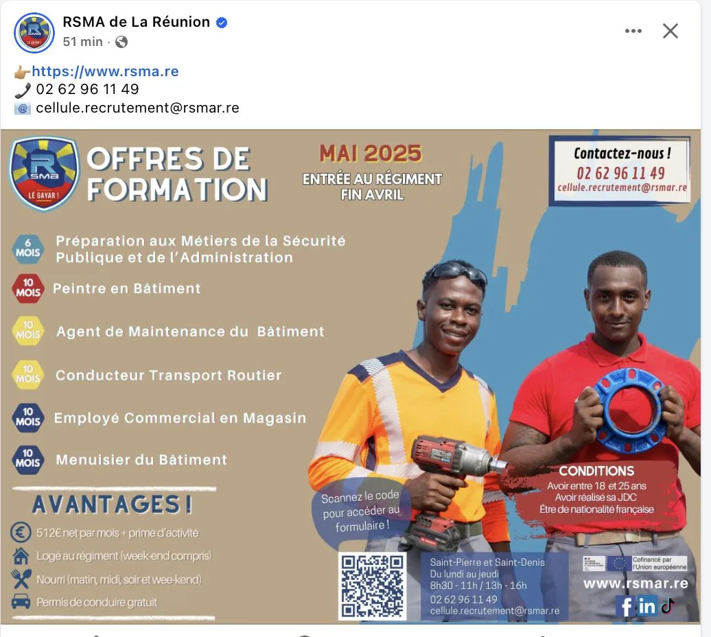 Le RSMA de La Réunion valorise des formations locales concrètes, rémunérées et débouchant sur l’emploi. À partir de fin avril, de nouvelles sessions de formations débuteront pour la vague de recrutement de mai 2025, avec une large gamme de métiers essentiels pour le territoire.