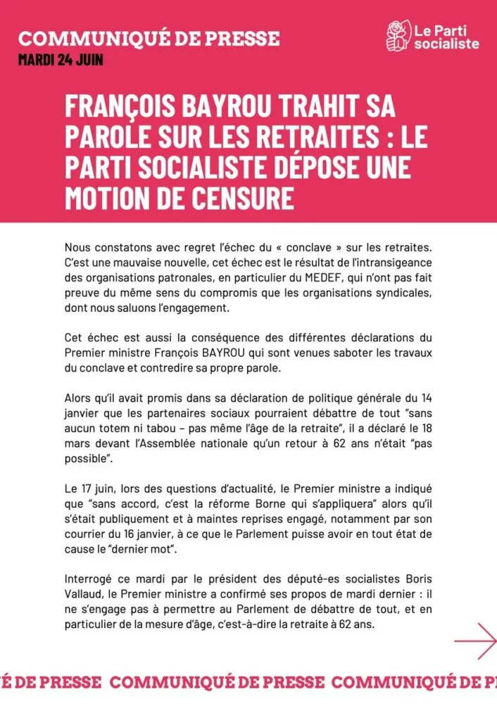 Le Parti socialiste a annoncé, mardi 24 juin, le dépôt d’une motion de censure à l’encontre du gouvernement dirigé par François Bayrou. Cette décision intervient dans un climat de tension croissante autour du dossier des retraites, marqué par l’échec du « conclave » censé réunir syndicats et patronat pour parvenir à un compromis.