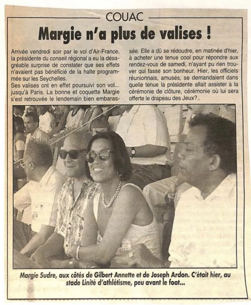 La délégation de La Réunion était fièrement représentée par Margie Sudre, présidente du conseil régional à l’époque. Cependant, à son arrivée aux Seychelles, une surprise de taille l’attendait : ses bagages avaient été égarés en chemin ! Archive le Réunionnais