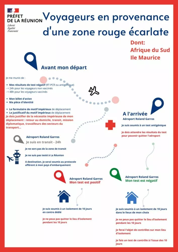 Modalités de voyage en provenance d’une zone « rouge écarlate », à compter du samedi 04 décembre 2021, pour les passagers en provenance de l’Île Maurice et d’Afrique du Sud :