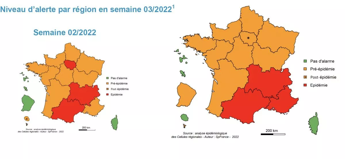 Un seul prélèvement positif de grippe avait été identifié par la surveillance virologique hospitalière en S02/22 contre 4 en S01/22.