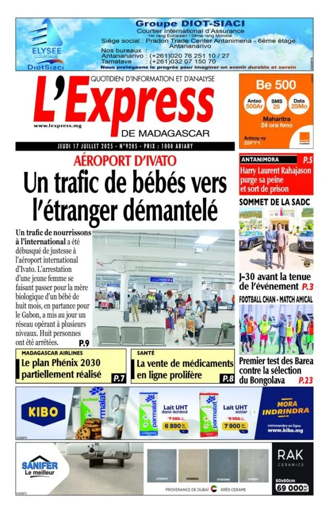 Un réseau de trafic de bébés a été démantelé à l’aéroport d’Ivato. Une femme se faisant passer pour la mère d’un nourrisson a été arrêtée alors qu’elle s’apprêtait à embarquer pour le Gabon. L’enquête a mené à l’arrestation de huit individus. Le journal évoque aussi la vente croissante de médicaments en ligne et le bilan en demi-teinte du plan économique “Phénix 2030”.