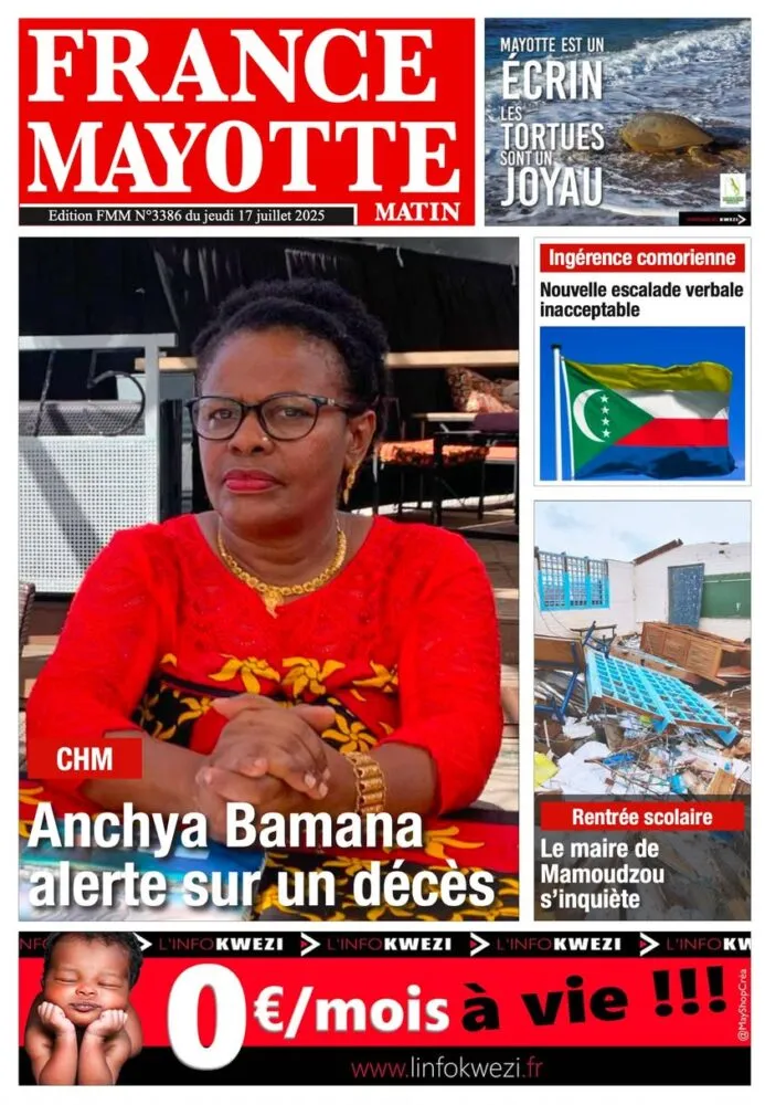 Anchya Bamana, figure locale bien connue, alerte sur un décès au centre hospitalier de Mayotte. Le journal évoque aussi une nouvelle escalade verbale dans les tensions diplomatiques avec les Comores. Le maire de Mamoudzou, de son côté, s’inquiète des conditions de la rentrée scolaire à venir.