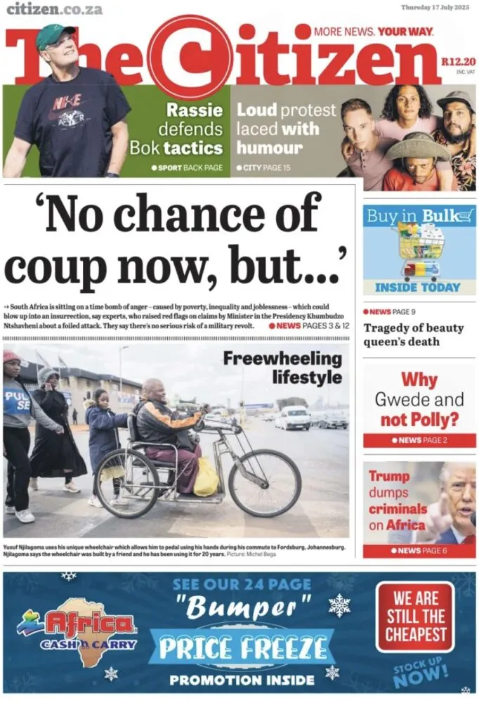Le journal met en lumière une inquiétude croissante : bien qu’aucun coup d’État ne soit imminent selon les experts, la pauvreté, le chômage et les inégalités alimentent une colère sociale latente qui pourrait dégénérer. En Une également, une scène insolite de Johannesburg avec un homme handicapé utilisant un fauteuil roulant personnalisé à pédales pour ses déplacements.