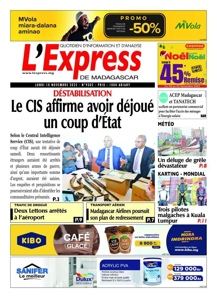 Madagascar – L’Express de MadagascarL’actualité est dominée par l’annonce du Central Intelligence Service (CIS) affirmant avoir déjoué une tentative de coup d’État le week-end dernier. Deux ressortissants étrangers ont été arrêtés, plusieurs armes de guerre et une importante somme d’argent saisies. L’enquête se poursuit pour identifier les commanditaires présumés. Le journal évoque aussi la poursuite du plan de redressement de Madagascar Airlines et l’arrestation de deux trafiquants à l’aéroport.
