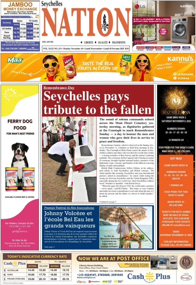 Seychelles – Seychelles NationLa une est consacrée à la cérémonie du Remembrance Day, en hommage aux soldats tombés pour la liberté. L’événement s’est tenu au cimetière de Mont Fleuri en présence des autorités et du corps diplomatique. Le journal met aussi en avant le Festival du film francophone, marqué par la victoire de Johnny Volcère et de l’école Bel Eau, ainsi que des initiatives éducatives locales.