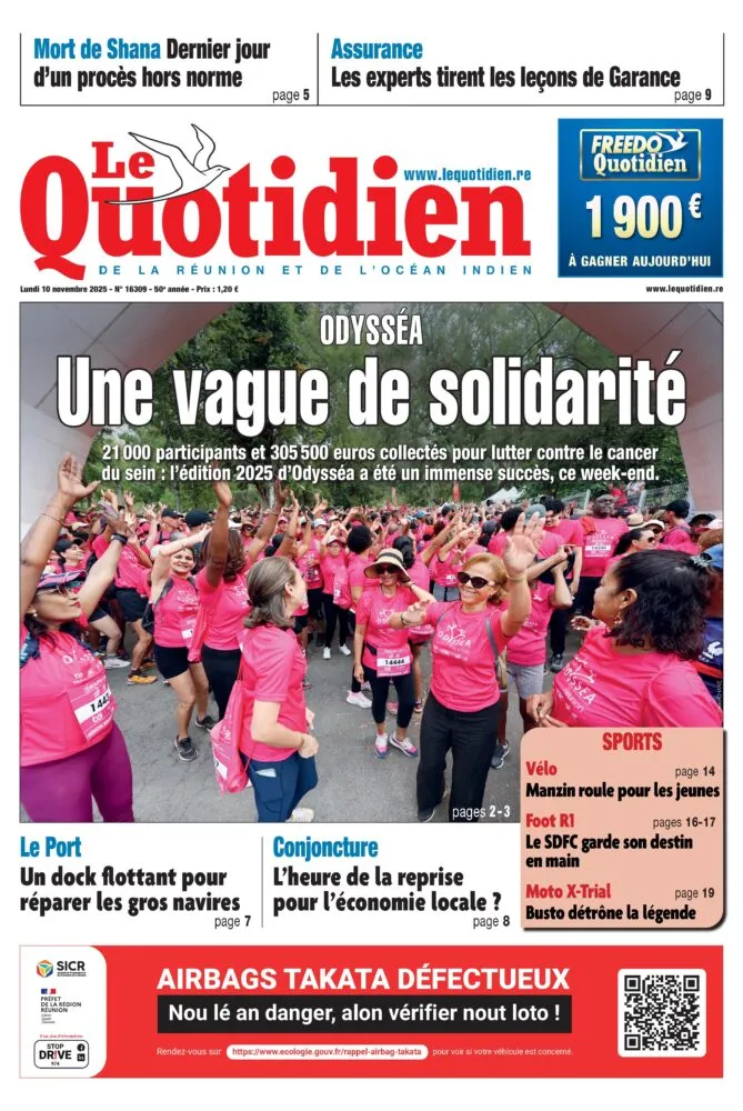 La Réunion – Le QuotidienSous le titre « Une vague de solidarité », le Quotidien de La Réunion met en avant l’édition 2025 d’Odyssea, un immense succès populaire avec 21 000 participants et plus de 305 000 euros collectés pour la lutte contre le cancer du sein. Le journal aborde également la reprise économique locale et le développement d’un dock flottant au Port destiné à la maintenance de gros navires. Côté sport, il revient sur la dernière journée du championnat régional (R1) et sur la dynamique du cyclisme jeunesse.