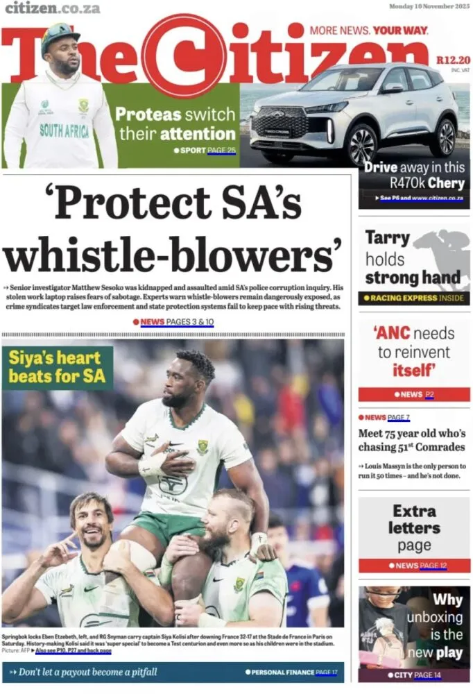 Afrique du Sud – The CitizenLe quotidien sud-africain tire la sonnette d’alarme sur la nécessité de protéger les lanceurs d’alerte après l’enlèvement et l’agression d’un enquêteur anticorruption. Selon The Citizen, les témoins restent gravement exposés dans un contexte d’augmentation des menaces. En sport, la victoire du capitaine Siya Kolisi et des Springboks contre la France au Stade de France est largement saluée.