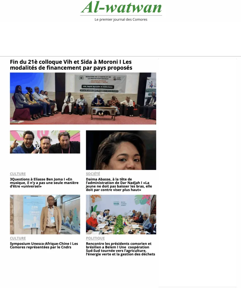 Comores – Al-WatwanLe premier journal comorien clôture le 21e colloque VIH/Sida à Moroni, axé sur les nouveaux modes de financement régionaux. Il revient aussi sur la coopération Afrique–Chine–Unesco et la rencontre entre les présidents comorien et brésilien à Belém, centrée sur l’agriculture, l’énergie verte et la gestion des déchets. L’édition inclut une interview de Daïma Abasse, figure montante de la culture et de la jeunesse.