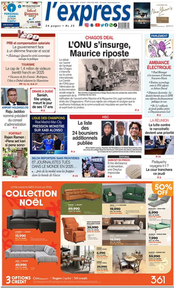 Dans L’Express, nouvel épisode du dossier Chagos : l’ONU s’insurge et Maurice riposte après une résolution jugée défavorable à Londres. Le cap de 1,4 million de visiteurs devrait être franchi avant la fin de l’année, tandis que le gouvernement fait face au dilemme financier du PRB et de la compensation salariale. Le quotidien publie aussi la liste actualisée des 24 boursiers additionnels du HSC.