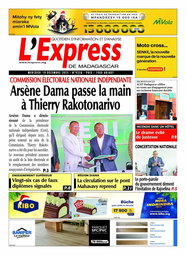 Dans L’Express de Madagascar, la Commission électorale est au premier plan : Arsène Dama quitte la présidence de la CENI et passe la main à Thierry Rakotonarivo, qui promet un audit de la liste électorale.