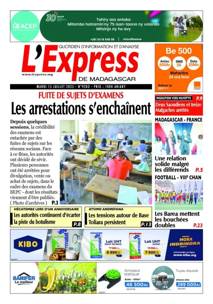 À Madagascar, L’Express s’alarme d’une nouvelle fuite massive de sujets d’examens, un phénomène récurrent qui fragilise la crédibilité du système éducatif. Les autorités ont multiplié les arrestations pour tentative de tricherie. En parallèle, la rubrique “Migration” signale l’interpellation de treize Malgaches en lien avec des traversées illégales vers Mayotte.